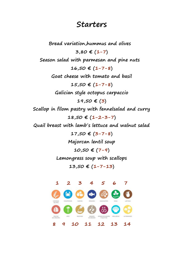 Our menu is based on seasonal market produce and fresh fish from local fisheries. With our food we serve wines from Majorcan and international vineyards. Our menu is constantly evolving, so feel free to ask our staff for any changes or daily specials!